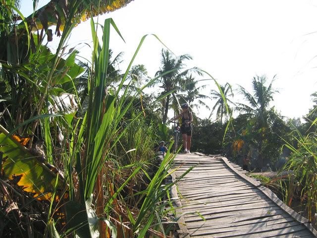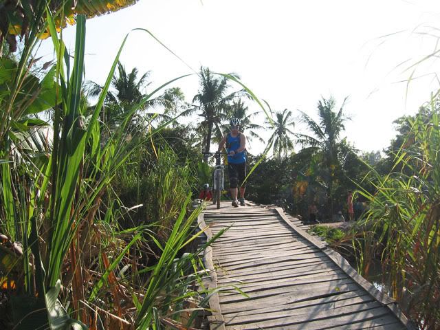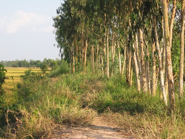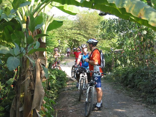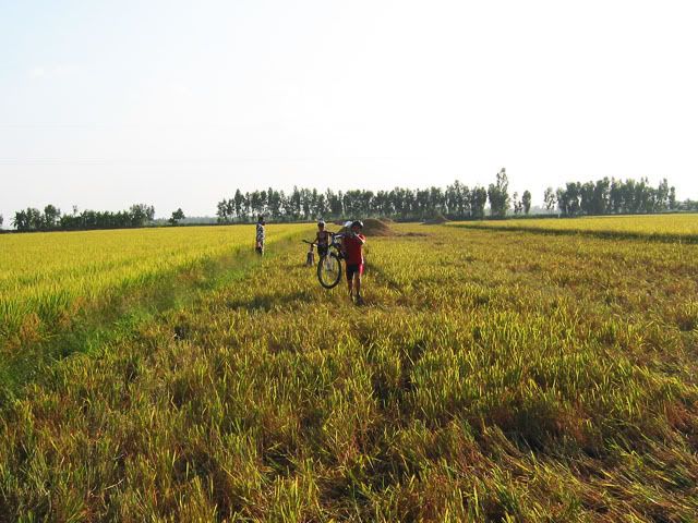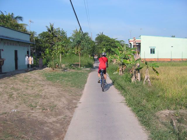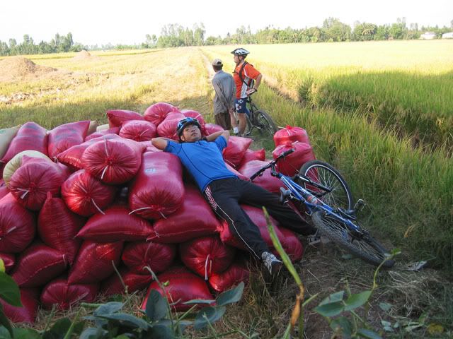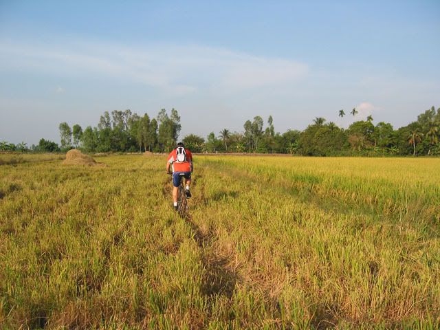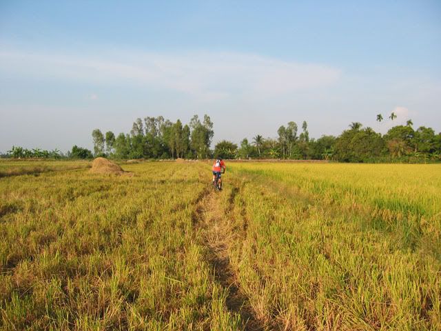 Chiếu hôm qua, chúng tôi gồm 2 người nước ngoài và 3 người Việt nam vừa hoàn thành xong tour vòng quanh vựa lúa của Vĩnh Long. Chúng tôi khởi hành từ cầu tàu của KS Victoria bằng tàu con thoi tới bờ bên kia của Vĩnh Long. Sau khi tàu cặp bến chúng tôi lên bờ cùng với những con chiến mã của mình bắt đầu cuộc hành trình len lỏi qua những cánh đồng trù phú và những vườn cây vô cùng thú vị. Thật sự mà nói đi trên những con đường nầy chỉ có MTB là thích hợp nhất. Chúng tôi càng đi càng thích, có những con đường chỉ khoảng 30cm vừa đủ để 1 người chay qua, một bên là bụi cây rậm rạp còn bên kia là bờ sông. Cái cảm giác rất thú vị khi chúng tôi chạy trên những con đường nầy, càng khó đi chúng tôi lại càng muốn đi hơn. trước đây riêng bản thân tôi không thích MTB lắm, nhưng từ khi đi qua những con đường nầy tôi lại yêu nó từ lúc nào không hay. Xin mời các bạn cùng chúng tôi tham quan vựa lúa của Vĩng Long qua loạt ảnh sau: